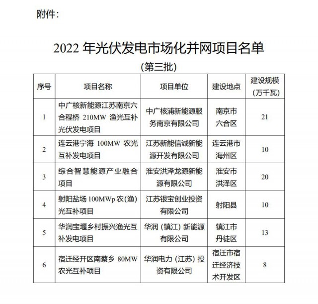 為積極貫徹落實(shí)國家“碳達(dá)峰碳中和”長期目標(biāo),推動我省光伏發(fā)電平穩(wěn)有序發(fā)展,按照《省發(fā)展改革委關(guān)于開展2022年光伏發(fā)電市場化并網(wǎng)項(xiàng)目開發(fā)建設(shè)的通知》(蘇發(fā)改能源發(fā)〔2022〕350號)有關(guān)要求,現(xiàn)將我省2022年光伏發(fā)電市場化并網(wǎng)項(xiàng)目(第三批)名單予以公布。