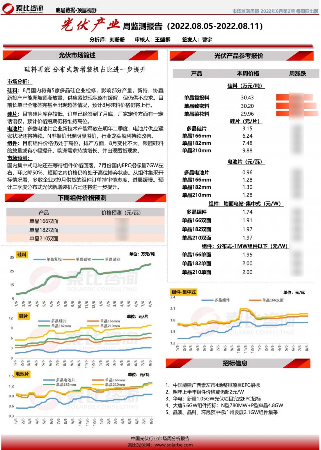 光伏產(chǎn)業(yè)周監(jiān)測(cè)報(bào)告系索比咨詢(xún)對(duì)于光伏產(chǎn)業(yè)鏈上下游價(jià)格的監(jiān)測(cè)與預(yù)報(bào),幫助企業(yè)獲得最實(shí)時(shí)的參考價(jià)格。每周除了對(duì)硅料、硅片、電池片、組件、輔材等價(jià)格進(jìn)行追蹤和分析外,亦關(guān)注下游招標(biāo)動(dòng)態(tài),并對(duì)后續(xù)市場(chǎng)趨勢(shì)做出研判。