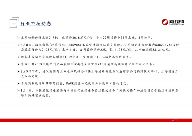 光儲(chǔ)投資周記系索比咨詢與買方機(jī)構(gòu)合作的日常投研回顧。每周除了簡(jiǎn)要回顧光儲(chǔ)賽道政策、產(chǎn)業(yè)動(dòng)態(tài)、索比獨(dú)家重大資訊等產(chǎn)業(yè)信息外,亦對(duì)二級(jí)市場(chǎng)光儲(chǔ)賽道表現(xiàn)、共建投資組合表現(xiàn)、賽道重要觀點(diǎn)進(jìn)行跟蹤、分析研判。