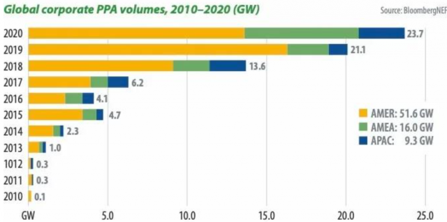 根據(jù)BNEF的數(shù)據(jù),2020年公司性PPA(主要是太陽能和風(fēng)能)的容量飆升至創(chuàng)紀(jì)錄的23.7GW。而這種上升趨勢(shì)將一直延續(xù)。