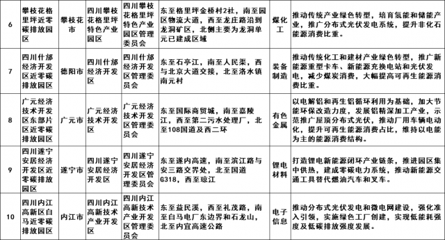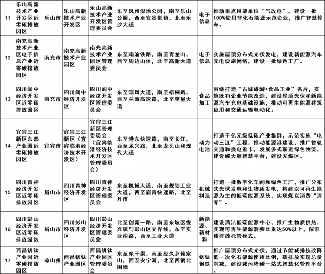 四川省近零碳排放園區(qū)試點擬確定名單(含試點園區(qū)名稱、所屬地區(qū)、所屬園區(qū)、申報主體、試點范圍、主導產(chǎn)業(yè)、試點特色),共17家園區(qū)。
