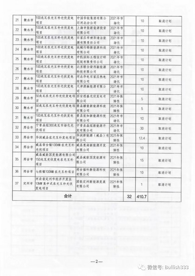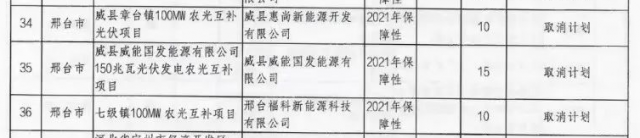 根據(jù)文件來看,相比此前發(fā)布的《風電、光伏發(fā)電項目擬調(diào)整情況公示》來看,光伏新增取消三個2021年光伏保障性項目指標,規(guī)模總計為350MW,風電則未發(fā)生變化。需要注意的是,三個光伏項目均為農(nóng)光互補類項目,其業(yè)主分別為惠尚新能源開發(fā)、威縣威能國發(fā)能源以及中國電建。