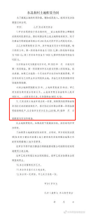 但是根據(jù)一份在網(wǎng)絡上流傳、未簽訂土地租賃合同文件,“已經(jīng)流轉土地由村委會統(tǒng)一經(jīng)營,流轉期內(nèi)按照每畝每年660元返還被流轉農(nóng)戶”。