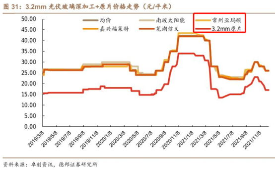 以3.2mm光伏玻璃為例。過去幾年,剔除異常波動年份,加工后的光伏玻璃價(jià)格基本在25元/平米左右,原片價(jià)格約為15元/平米。價(jià)差10元/平米。