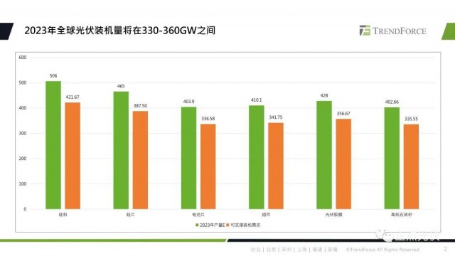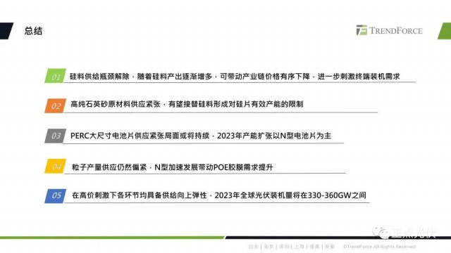首先對(duì)產(chǎn)業(yè)鏈各環(huán)節(jié)2023年的市場(chǎng)量以及光伏裝機(jī)量進(jìn)行預(yù)估。從數(shù)據(jù)上看,2023年硅料整體供應(yīng)充足,不再是制約產(chǎn)業(yè)發(fā)展的瓶頸環(huán)節(jié)。硅片端因?yàn)楦呒兪⑸暗墓?yīng)偏緊,從而造成了坩鍋產(chǎn)出的受限,這也將影響到硅片的實(shí)際產(chǎn)出。電池片環(huán)節(jié)因?yàn)?022年下半年以來(lái),新建產(chǎn)能主要還是以n型技術(shù)為主,新技術(shù)產(chǎn)能釋放具有較大不確定性。PERC的產(chǎn)能擴(kuò)張?zhí)幱谕顟B(tài),2023年大尺寸PERC電池片或?qū)⒊霈F(xiàn)供需緊平衡的狀態(tài)。主要還是關(guān)注TOPCon電池片的實(shí)際產(chǎn)出。膠膜方面,poe粒子目前主要還是依賴進(jìn)口,隨著n型需求的提升,poe粒子的供應(yīng)端也會(huì)較為緊張。但是以上各環(huán)節(jié)在較高的資金刺激下,實(shí)際產(chǎn)出都具備了向上的彈性。所以綜合的產(chǎn)業(yè)鏈的實(shí)際產(chǎn)出數(shù)據(jù),我們預(yù)計(jì)2023年全球裝機(jī)量將在330-360GW之間。