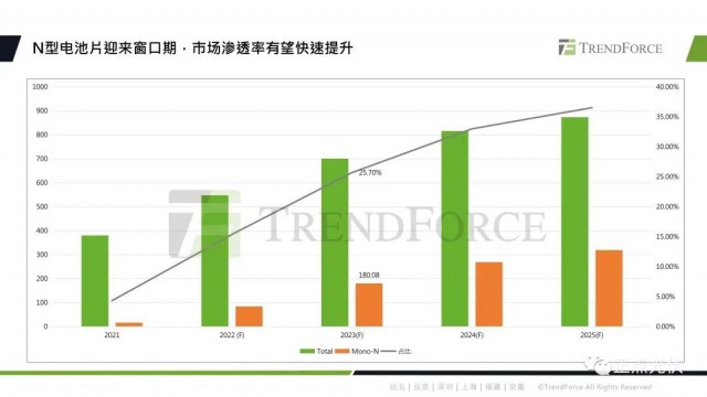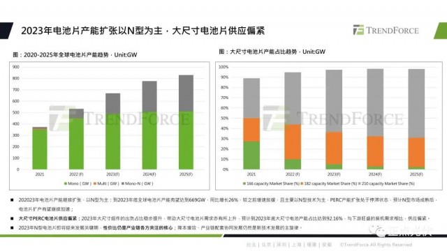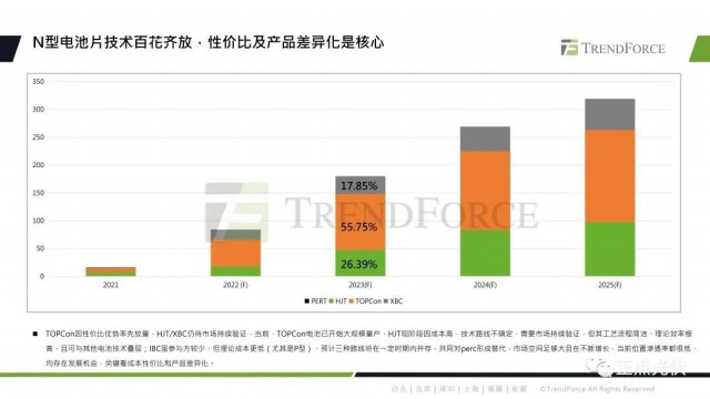TOPCon因?yàn)樗男詢r(jià)比優(yōu)勢(shì),實(shí)現(xiàn)了率先放量。預(yù)計(jì)到2023年底,N型電池片的產(chǎn)能將達(dá)到180GW,占比約為25.7%。