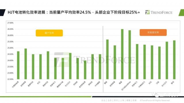 再來(lái)具體看一下HJT技術(shù)產(chǎn)能進(jìn)展及效率方面。目前HJT技術(shù)發(fā)展進(jìn)入瓶頸期,全球企業(yè)宣告的已建成產(chǎn)能為11.6GW。雖然規(guī)劃的產(chǎn)能比較多,但是待建的產(chǎn)能還是比較少的。核心原因還是因?yàn)楫?dāng)前HJT的生產(chǎn)成本相對(duì)較高,與PERC量產(chǎn)效率并未顯出更高水平,產(chǎn)品溢價(jià)有限。