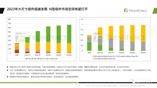 到2023年大尺寸組件產(chǎn)能預(yù)計(jì)575GW,市場(chǎng)占有率達(dá)89%,166及以下尺寸組件產(chǎn)品進(jìn)一步萎縮,隨著市場(chǎng)需求轉(zhuǎn)移,企業(yè)舊產(chǎn)能淘汰升級(jí),166市占比僅為6.5%。大尺寸應(yīng)用場(chǎng)景多元化,地面電站的應(yīng)用主要以大尺寸為主,在分布式中企業(yè)也在推進(jìn)大尺寸的應(yīng)用,以適應(yīng)市場(chǎng)需求。N型組件因?yàn)橄碛邢冗M(jìn)技術(shù)帶來(lái)的產(chǎn)品溢價(jià),經(jīng)濟(jì)效益較好,企業(yè)有望加速推進(jìn)。