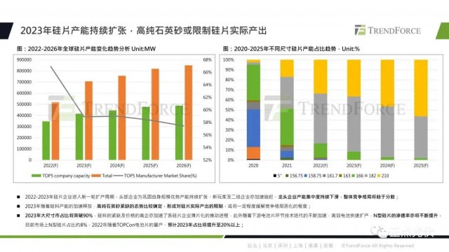 接下來(lái)是硅片的產(chǎn)能以及技術(shù)方向。2023年,硅片企業(yè)進(jìn)入了新一輪的擴(kuò)產(chǎn)周期,頭部企業(yè)為了保護(hù)自身規(guī)模優(yōu)勢(shì),產(chǎn)能在持續(xù)擴(kuò)張。新玩家以及二線企業(yè)也在持續(xù)的擴(kuò)張產(chǎn)能,龍頭企業(yè)的產(chǎn)能集中度在持續(xù)的下滑,整體行業(yè)的競(jìng)爭(zhēng)格局趨于分散。在硅片生產(chǎn)環(huán)節(jié)中需要用到的坩鍋材料、高純石英砂緊缺的態(tài)勢(shì)也是比較確定的,這也將對(duì)硅片的實(shí)際產(chǎn)出形成限制。但這也在一定程度上緩解了硅片競(jìng)爭(zhēng)格局的惡化。大尺寸及薄片化也是比較確定的,2023年大尺寸市占比將突破90%,硅料的緊缺以及價(jià)格高企加速了各硅片企業(yè)薄片化的推動(dòng)進(jìn)程。此外,隨著下游電池片環(huán)節(jié)技術(shù)迭代的不斷加速,n型硅片的滲透率也將不斷提升,目前,n型硅片的總體產(chǎn)量還比較低,占比大約是在8%左右。隨著TOPCon電池片的量產(chǎn),預(yù)計(jì)2023年占比將提升至20%以上。
