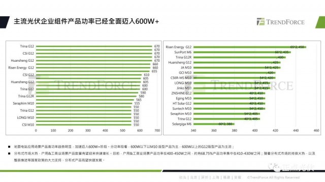 目前主流光伏企業(yè)組件產(chǎn)品功率已全面邁入了600W+,分功率段來(lái)看,600W以下以M10版型產(chǎn)品為主,600W以上的主要以G12版型產(chǎn)品為主。產(chǎn)品數(shù)量有望快速增長(zhǎng),目前來(lái)看,戶用及工商業(yè)場(chǎng)景產(chǎn)品功率大多在400到450W之間。隨著分布式市場(chǎng)的持續(xù)火熱,和整縣推進(jìn)國(guó)家政策的大力支持,分布式產(chǎn)品有望快速發(fā)展。