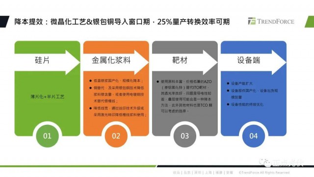 目前HJT技術(shù)降本增效的路徑還是比較確定的,硅片端主要是薄片化以及半片工藝的發(fā)展,金屬化漿料方面,包括低溫銀漿的國(guó)產(chǎn)化、規(guī)?;当?銀包銅、電鍍銅上降低銀漿的耗量,靶材價(jià)格以及用量的下降,還有設(shè)備國(guó)產(chǎn)化、規(guī)?;当镜确矫?。
