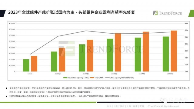 組件環(huán)節(jié)。全球組件產(chǎn)能也在持續(xù)的擴(kuò)張,2023年底組件產(chǎn)能達(dá)642GW,同比增長(zhǎng)了21.8%。其中國(guó)內(nèi)組件企業(yè)擴(kuò)產(chǎn)產(chǎn)能占多數(shù),海外地區(qū)產(chǎn)能增長(zhǎng)主要是國(guó)內(nèi)一、二線類企業(yè)在東南亞的產(chǎn)能布局。還有像歐洲、印度、美國(guó)、韓國(guó)等地受本土化支持,部分當(dāng)?shù)氐慕M件企業(yè)也有新建產(chǎn)能釋放。2023年,隨著在規(guī)模優(yōu)勢(shì)、成本優(yōu)勢(shì)以及品牌渠道優(yōu)勢(shì),一體化組件廠商有望率先受益,盈利得到修復(fù)。