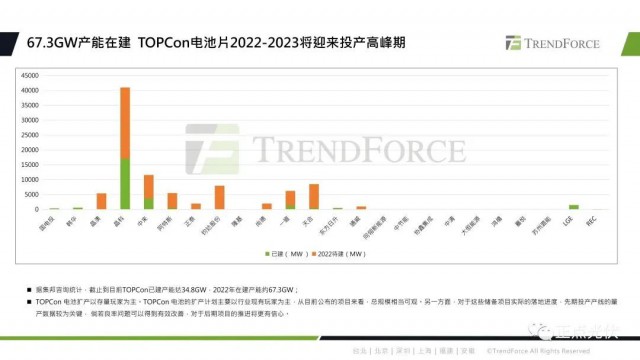 具體來(lái)看TOPCon技術(shù)的產(chǎn)能進(jìn)展與效率方面。據(jù)統(tǒng)計(jì),截止到目前,TOPCon的已建產(chǎn)能大約是在34.8GW,2022年再建產(chǎn)能約為67.3GW。從目前公布的項(xiàng)目來(lái)看,規(guī)模還是十分可觀的。目前TOPCon電池的擴(kuò)產(chǎn)還是以存量玩家為主,儲(chǔ)備項(xiàng)目前期投產(chǎn)的量產(chǎn)數(shù)據(jù)會(huì)比較關(guān)鍵,如果良率方面的問題可以得到有效的改善,后期項(xiàng)目的推進(jìn)將會(huì)更有信心。