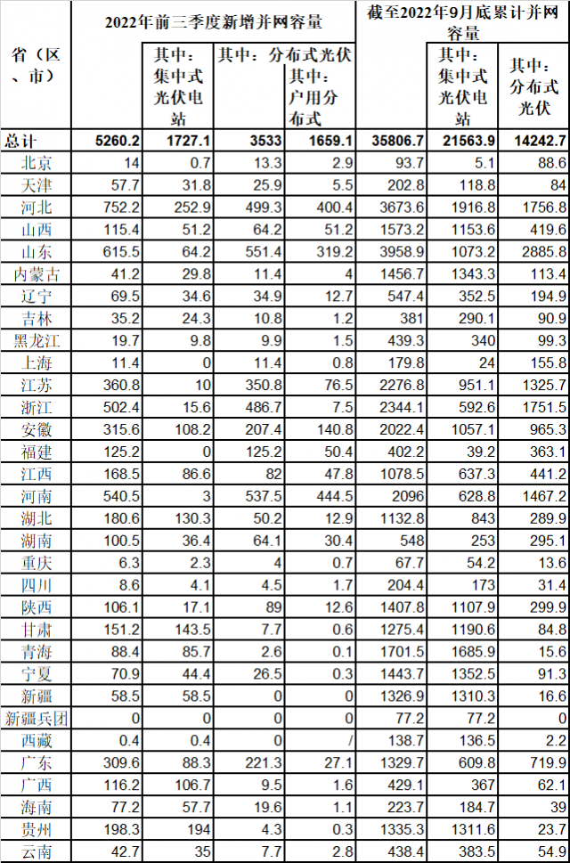 2022年前三季度光伏發(fā)電建設(shè)運(yùn)行情況
