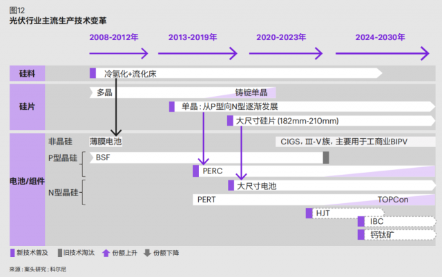 其一,單瓦組件成本長(zhǎng)期將逐步下降,主要得益于技術(shù)演進(jìn)帶來(lái)的轉(zhuǎn)換效率提升。電池組件主流技術(shù)正在快速演進(jìn)迭 代( 如 圖 12),已 經(jīng) 從 傳 統(tǒng) P 型 向 PERC+ 和 N 型TOPCon 及 HJT 發(fā)展,未來(lái)隨著新型技術(shù)的發(fā)展,如具備成本優(yōu)勢(shì)的鈣鈦礦在突破穩(wěn)定性瓶頸后、其疊層電池大幅提升太陽(yáng)光利用水平,將有可能進(jìn)一步大幅降低降低單位成本。同時(shí),隨規(guī)模效應(yīng)顯現(xiàn),單位產(chǎn)線投資成本下降以及人均產(chǎn)出率提升將進(jìn)一步拉低電池組件成本。