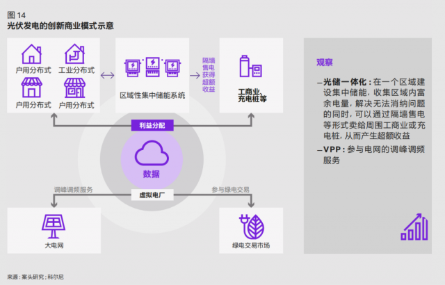 一邊是消納困局、一邊是電價(jià)短期波動(dòng)風(fēng)險(xiǎn),戶用光伏發(fā)電正經(jīng)歷著來(lái)自市場(chǎng)的新考驗(yàn)。結(jié)合光伏發(fā)電商業(yè)模式判斷,未來(lái)光儲(chǔ)一體化和虛擬電網(wǎng)兩種創(chuàng)新模式的發(fā)展或成為針對(duì)上述挑戰(zhàn)的最優(yōu)解法(如圖 14)。