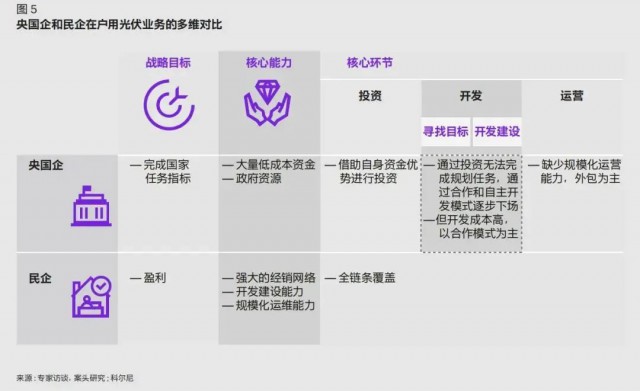 由于央國(guó)企和民營(yíng)企業(yè)對(duì)于戶用光伏的戰(zhàn)略定位、切入賽道和自身能力均不同,因此其各自具備獨(dú)特的商業(yè)模式,且在產(chǎn)業(yè)鏈上逐漸形成互補(bǔ)合作的上下游關(guān)系(如圖 5)。
