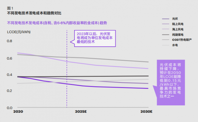 能源結(jié)構(gòu)調(diào)整無(wú)疑是能源戰(zhàn)略中最重要的一環(huán)。在眾多新能源發(fā)展路線中,光伏是最優(yōu)質(zhì)的選項(xiàng)之一,光伏發(fā)電技術(shù)成本優(yōu)勢(shì)突出。科爾尼預(yù)測(cè),到 2023 年后,光伏發(fā)電的平準(zhǔn)化度電成本(LCOE)將在所有發(fā)電技術(shù)中達(dá)到最低,并預(yù)計(jì)在 2050 年進(jìn)一步下降至 0.15 元 /kWh(如圖 1)。成本優(yōu)勢(shì)下,光伏有潛力成為未來(lái)中長(zhǎng)期發(fā)展最快的細(xì)分賽道。