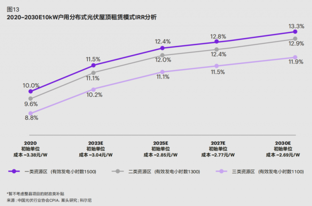 系統(tǒng)成本的大幅下降將大幅提升收益率。據(jù)科爾尼預(yù)測(cè),在未來(lái)三類資源區(qū)的屋頂租賃模式 IRR 都將穩(wěn)步上升,并將 于 2030 年分別增至 13.3%、12.9% 和 11.9%(如圖13)。