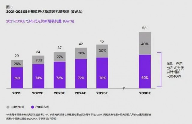 根據(jù)市場(chǎng)趨勢(shì),科爾尼認(rèn)為, 2025 年以前戶用光伏會(huì)在政策和盈利性提升驅(qū)動(dòng)下大幅提速,后期隨著整縣推進(jìn)結(jié)束,預(yù)期 2025-2030 增速會(huì)略有放緩。保守預(yù)計(jì)中國(guó)市場(chǎng)到 2030 年將累計(jì)增加戶用光伏超過(guò) 300GW,市場(chǎng)空間廣闊(如圖 3)。