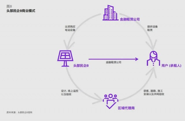 與民企 A 大量資產(chǎn)自持模式不同,民企 B 打造了一條輕資產(chǎn)模式(如圖 8):引入金融租賃公司授信托底,自己則作為開(kāi)發(fā)方賺取差價(jià),同時(shí)提供帶運(yùn)維服務(wù)以獲得持續(xù)的管理費(fèi)收入。民企B的核心優(yōu)勢(shì)在于其家電業(yè)務(wù)所積累的廣泛渠道資源,與此同時(shí),通過(guò)大幅度讓利經(jīng)銷商并提供更快付款節(jié)奏,公司在前期搶占了部分市場(chǎng)資源。