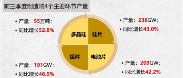 從制造環(huán)節(jié)來看,旺盛的市場需求驅(qū)動(dòng)制造端強(qiáng)勁增長。前三季度,多晶硅、硅片、組件、電池片4個(gè)環(huán)節(jié)的增長速度均超過40%。其中,多晶硅產(chǎn)量55萬噸,同比增長52.8%;硅片產(chǎn)量236GW,同比增長43%;組件產(chǎn)量191GW,同比增長46.9%;電池片產(chǎn)量209GW,同比增長42.2%。