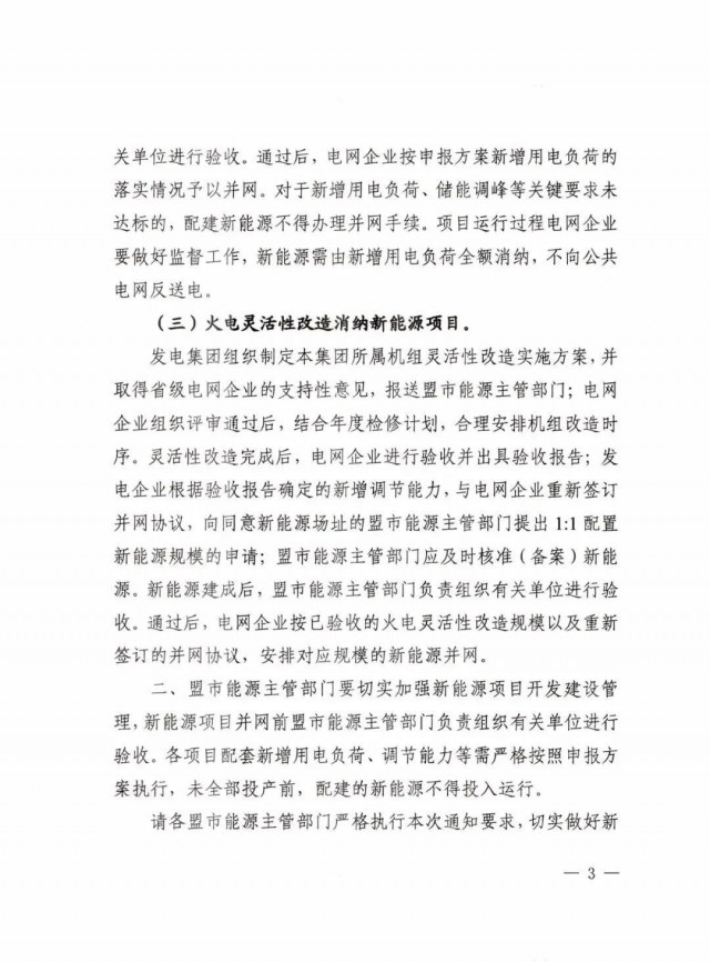 發(fā)電集團組織制定本集團所屬機組靈活性改造實施方案,并取得省級電網(wǎng)企業(yè)的支持性意見,報送盟市能源主管部門:電網(wǎng)企業(yè)組織評審通過后,結合年度檢修計劃,合理安排機組改造時序。靈活性改造完成后,電網(wǎng)企業(yè)進行驗收并出具驗收報告:發(fā)電企業(yè)根據(jù)驗收報告確定的新增調節(jié)能力,與電網(wǎng)企業(yè)重新簽訂并網(wǎng)協(xié)議,向同意新能源場址的盟市能源主管部門提出 1:1 配置新能源規(guī)模的申請;盟市能源主管部門應及時核準(備案)新能源。新能源建成后,盟市能源主管部門負責組織有關單位進行驗收。通過后,電網(wǎng)企業(yè)按已驗收的火電靈活性改造規(guī)模以及重新簽訂的并網(wǎng)協(xié)議,安排對應規(guī)模的新能源并網(wǎng)。