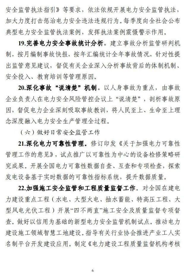 加強(qiáng)施工安全監(jiān)管和工程質(zhì)量監(jiān)督工作。對(duì)全國在建電力建設(shè)重點(diǎn)工程(水電、大型火電、抽水蓄能、特高壓工程、大型風(fēng)電光伏工程)開展“四不兩直”施工安全及質(zhì)量監(jiān)督專項(xiàng)督查。做好以信用為基礎(chǔ)的新型電力安全監(jiān)管機(jī)制試點(diǎn)。