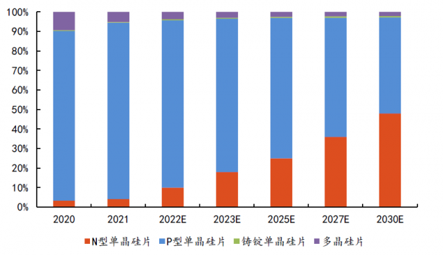 N型硅片滲透率持續(xù)提升,高性能坩堝需求激增。根據(jù)CPIA數(shù)據(jù),2021年N型單晶硅片滲透率約4.1%,隨著下游對單晶產(chǎn)品的需求增大,單晶硅片市場占比也將進一步增大,且N型單晶硅片占比將持續(xù)提升。