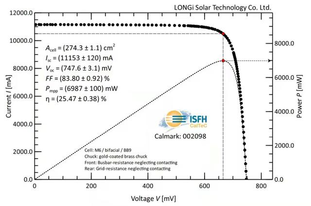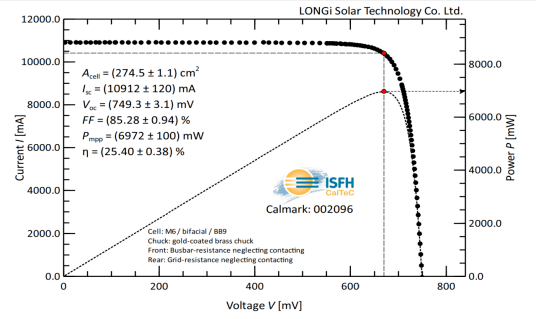 3月31日,繼3月29日宣布p-HJT 以25.47%打破世紀(jì)紀(jì)錄后,經(jīng)德國哈梅林太陽能研究所(ISFH)認(rèn)證,隆基研發(fā)團(tuán)隊在M6全尺寸(274.5cm2)單晶硅片上創(chuàng)造了無銦HJT電池25.40%轉(zhuǎn)換效率的新世界紀(jì)錄,持續(xù)夯實(shí)HJT電池低成本技術(shù)路線的產(chǎn)業(yè)化基礎(chǔ)。