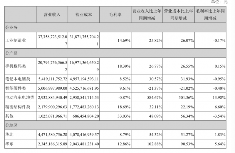 4月12日晚上,欣旺達(dá)公布了2021年的年報(bào)業(yè)績,整個(gè)2021年欣旺達(dá)實(shí)現(xiàn)了全年?duì)I業(yè)收入373.6億元,同比增長25.82%,歸母凈利潤為9.16億元,同比增長14.18%,扣非凈利潤為5.28億元,同比增長101.7%,毛利率為14.69%,基本持平,凈利率降低了0.4個(gè)百分點(diǎn)到2.29%。