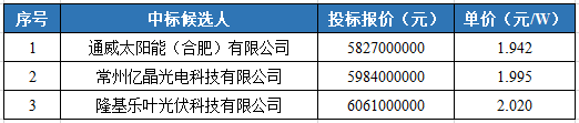 就在不久前,在華潤(rùn)電力近期的3GW組件組件招標(biāo)中,,硅料、電池片龍頭——通威股份,以1.942元/W的價(jià)格,成為第一中標(biāo)候選人!比第二、第三中標(biāo)候選人的價(jià)格,低0.055元/W以上!