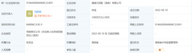 8月10日,通威太陽(yáng)能(海南)有限公司注冊(cè)成立,法定代表人為劉舒琪,注冊(cè)資本1億人民幣,經(jīng)營(yíng)范圍包括: