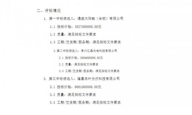 8月17日,華潤(rùn)電力第五批光伏項(xiàng)目光伏組件設(shè)備集中采購(gòu)中標(biāo)候選人公示。通威太陽(yáng)能、億晶光電、隆基樂(lè)葉3家企業(yè)分列前三中標(biāo)候選人,具體如下表所示。
