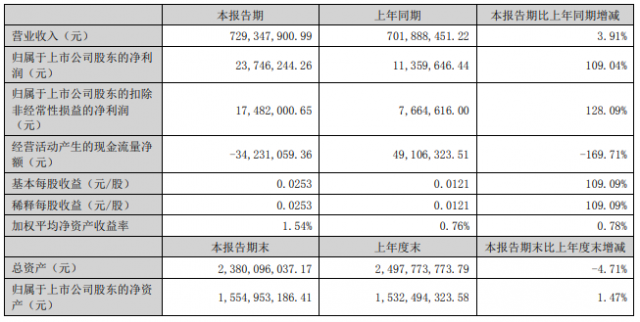 8月26日,北玻股份發(fā)布2022年上半年年度報(bào)告,報(bào)告期內(nèi),公司營(yíng)業(yè)收入729,347,900.99元,同比增加3.91%,歸屬于上市公司股東的凈利潤(rùn)23,746,244.26元,同比增加109.04%,詳情如下: