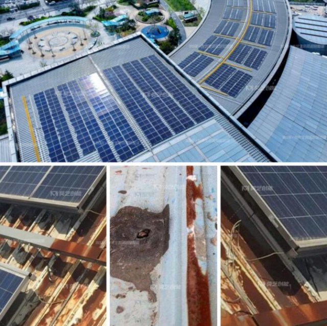 若只依靠彩鋼瓦本身的屋面,很容易因?yàn)橥繉雍穸炔粔颍又贤饩€、雨水、光合作用等自然因素的侵蝕,造成屋面彩鋼瓦接縫處開(kāi)裂、鉚釘松動(dòng)生銹、屋面銹蝕擴(kuò)大、瓦脊銹蝕銹穿導(dǎo)致屋面出現(xiàn)滲水漏水的情況。同時(shí)因其坡度小,可能會(huì)造成雨水排泄不暢、積水超過(guò)彩鋼瓦接縫高度或鉚釘孔高度及溝沿瓦而導(dǎo)致銹損滲漏。而工廠生產(chǎn)過(guò)程中排放的酸性、堿性等氣體長(zhǎng)期與屋面接觸,也會(huì)腐蝕鋼結(jié)構(gòu),加速銹蝕、穿孔導(dǎo)致滲漏。