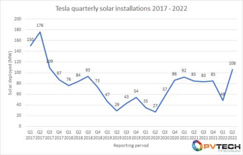 (特斯拉2017Q1-2022Q2太陽能設備安裝量 圖源:PVTECH)