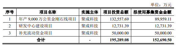 據(jù)悉,本次聚成科技擬募資15.27億元,其中約9億元擬用于年產(chǎn)9000萬公里金剛石線項目、1.27億元用于研發(fā)中心建設(shè)項目、5億元用于補充流動資金項目。