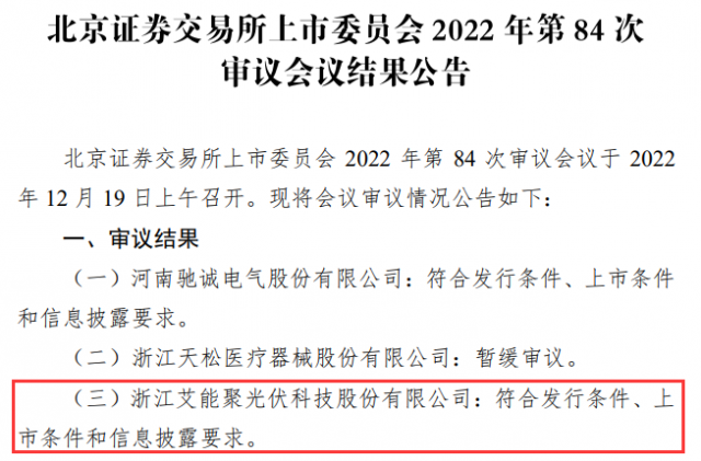 12月19日晚間,北京證券交易所上市委員會(huì)2022年第84次審議會(huì)議結(jié)果出爐,浙江艾能聚光伏科技股份有限公司(簡(jiǎn)稱(chēng)“艾能聚”)符合發(fā)行條件、上市條件和信息披露要求,成功過(guò)會(huì)。