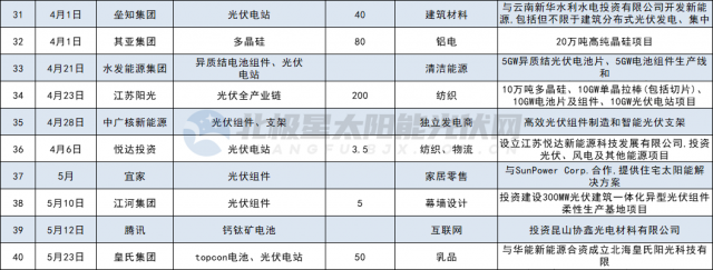 其他如多晶硅、硅片制造領(lǐng)域投資共7家,分別為合盛硅業(yè)、吉利、其亞集團、清電能源、中啟控股、風范股份、華民股份。光伏設(shè)備5家,分別為山東大業(yè)股份、東威科技、拓普集團、奧??萍肌⒔瘌欗?。光伏膠膜3家,分別為中石化、信義儲電、綠康生化;此外,江蘇陽光、寶豐大手筆投資全產(chǎn)業(yè)鏈。