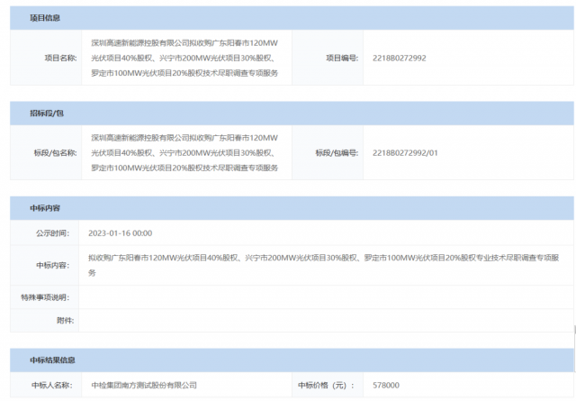 1月30日,深圳高速新能源控股有限公司公示了擬收購廣東陽春市120MW光伏項目40%股權(quán)、興寧市200MW光伏項目30%股權(quán)、羅定市100MW光伏項目20%股權(quán)技術(shù)盡職調(diào)查的中標候選人,中檢集團南方測試股份有限公司以57.8萬元的報價中標。