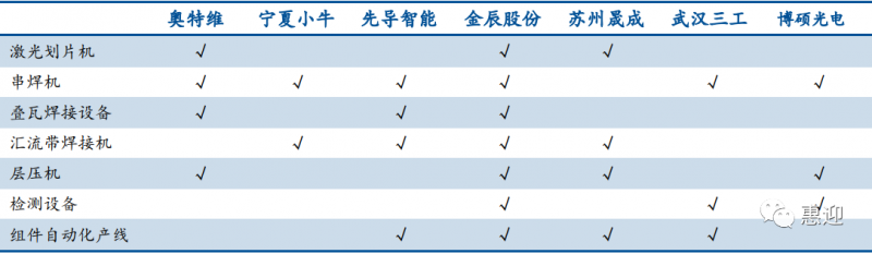 組件設(shè)備的市場較為分散,公司數(shù)量較多,競爭較為充分。組件設(shè)備國產(chǎn)化進(jìn)程較早,廠商可提供多種產(chǎn)品,充分利用技術(shù)同源和客戶同源優(yōu)勢。如奧特維可提供激光劃片機、串焊機、疊瓦串焊機、層壓機等設(shè)備,先導(dǎo)智能可提供串焊機、疊瓦一體焊接機、匯流條焊接機等設(shè)備,金辰股份可提供激光劃片機、串焊機、疊片焊接機、層壓機、匯流條焊接機、層壓機、EL 測試儀等設(shè)備。同時,先導(dǎo)智能、金辰股份、蘇州晟成、武漢三工還可提供組件自動化生產(chǎn)線。