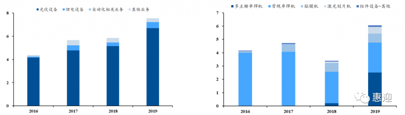 多主柵串焊機逐步成為公司光伏設(shè)備中的主要構(gòu)成產(chǎn)品。2018 年,公司多主柵串焊機開始放量,在公司光伏設(shè)備收入中占比約為 5.88%,2019 年,公司多主柵串焊機收入從 0.2 億元提升至 2.52 億元,占光伏設(shè)備收入中的 40.91%,超越常規(guī)串焊機,成為公司光伏設(shè)備業(yè)務(wù)中占比最高的業(yè)務(wù),成為公司的營業(yè)收入中占比最高的業(yè)務(wù)。未來,公司的串焊機有望深度受益于光伏組件技術(shù)迭代,在新一輪市場擴展中占據(jù)優(yōu)勢地位。