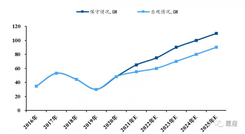 在中國向“30·60目標(biāo)”邁進(jìn)的過程中,“十四五”是實現(xiàn)碳達(dá)峰的關(guān)鍵時期,光伏發(fā)電大有可為。根據(jù) CPIA的觀察與分析,預(yù)計 2021 年新增裝機規(guī)模約為 55GW-65GW,預(yù)計“十四五”期間,國內(nèi)年均光伏新增裝機規(guī)模將達(dá) 70-90GW。由此推算,未來 5 年,光伏新增總裝機規(guī)模有望達(dá)到 350-450GW,同比“十三五”期間 210GW 的新增總裝機規(guī)模有較大幅度提升。