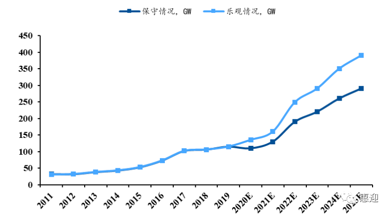 光伏行業(yè)降本提效穩(wěn)步推進(jìn),疊加全球各國可再生能源政策的頒布與執(zhí)行,預(yù)計全球光伏累計裝機容量將繼續(xù)保持增長態(tài)勢,根據(jù) CPIA 的預(yù)測,“十四五”期間,樂觀預(yù)期下,全球光伏裝機規(guī)模年均新增 287GW,中性情況下年均新增 222GW。該預(yù)期與 IRENA 于 2019 年年在分析報告《光伏的未來》給出的預(yù)測基本一致,IRENA 認(rèn)為,到 2030 年光伏的裝機目標(biāo)將達(dá)到 8500GW,年均光伏新增規(guī)模將超過 250GW。