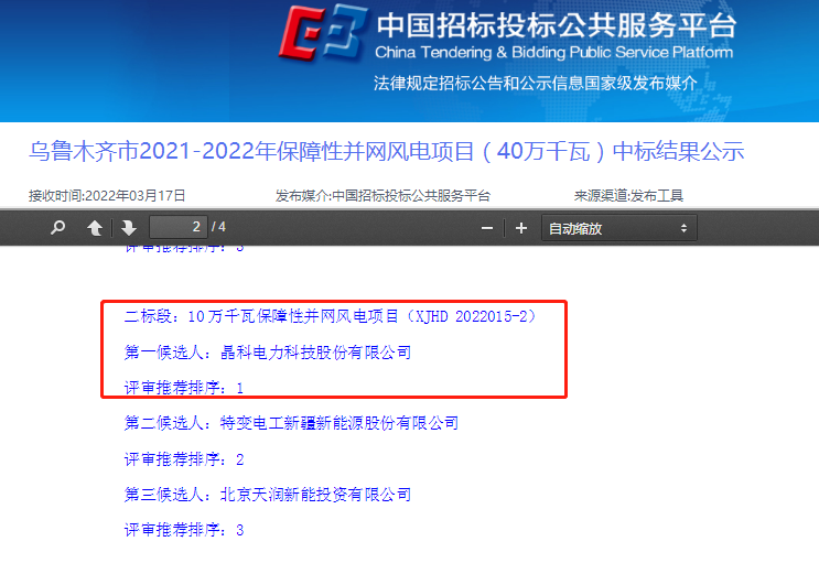 近日,烏魯木齊市2021-2022年保障性并網(wǎng)風(fēng)電項目(40萬千瓦)中標(biāo)結(jié)果公示,晶科科技(601778.SH)憑借領(lǐng)先的技術(shù)及良好的行業(yè)口碑,中標(biāo)了其中10萬千瓦(100MW)規(guī)模的保障性并網(wǎng)風(fēng)電項目。此次中標(biāo),是晶科科技成立以來首次獲得風(fēng)電項目,也是公司推動可再生、清潔能源開發(fā)利用之路上新的里程碑,標(biāo)志著公司正式進軍風(fēng)電市場。
