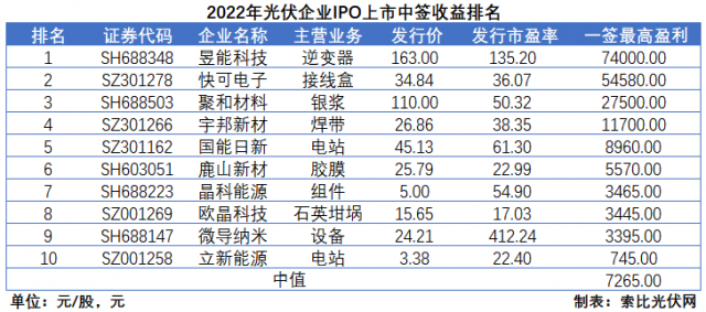 股票收益方面,10家企業(yè)上市首日平均最高收益達(dá)到7265元/簽,如果持有至年末更是能夠獲得平均2.05萬元/簽的收益。其中,昱能科技和快可電子上市首日最高收益分別高達(dá)7.4萬元/簽和5.46萬元/簽,高居A股市場前五位;聚和材料、宇邦新材亦有2.75萬元/簽和1.17萬元/簽的收益。