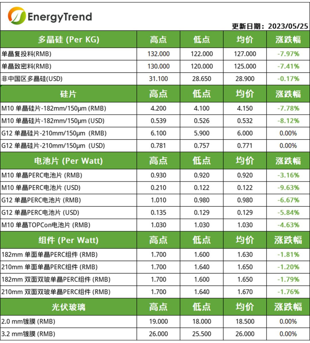 在終端持續(xù)壓價(jià)及上游電池片價(jià)格下降情況下,本周組件價(jià)格下滑明顯。近期大唐集團(tuán)8GW組件集采開標(biāo),P型組件投標(biāo)價(jià)格范圍為1.47元/W-1.655元/W。組件整體價(jià)格下降趨勢(shì)明顯,部分終端項(xiàng)目有望陸續(xù)啟動(dòng),在電池片價(jià)格企穩(wěn)情況下,組件價(jià)格或?qū)⒏S走穩(wěn)。
