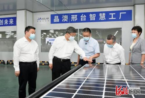 倪岳峰書(shū)記參觀(guān)了公司組件生產(chǎn)車(chē)間,聽(tīng)取晶澳發(fā)展歷程和基地生產(chǎn)研發(fā)現(xiàn)狀,并深入了解邢臺(tái)基地智慧工廠(chǎng)的建設(shè)思路、發(fā)展規(guī)劃等情況。