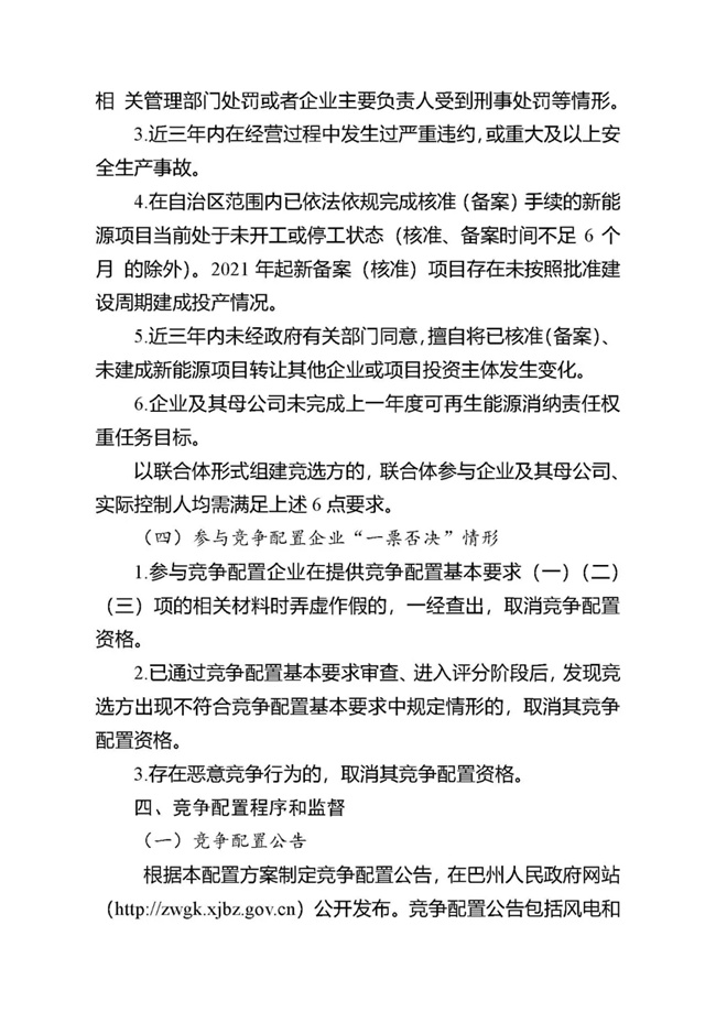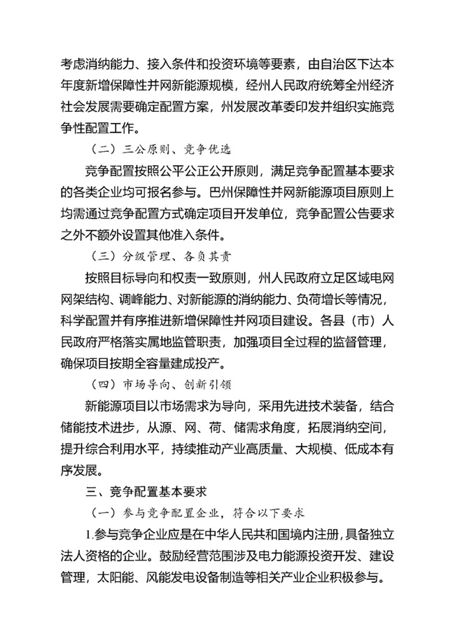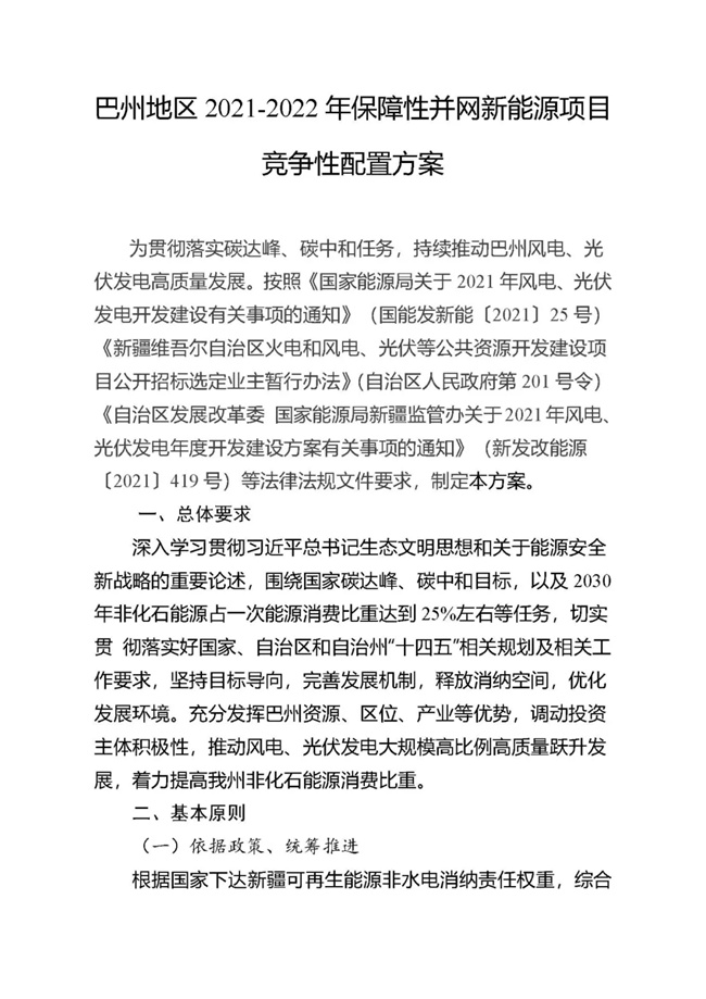 為貫徹落實碳達峰、碳中和任務,持續(xù)推動巴州風電、光伏發(fā)電高質(zhì)量發(fā)展。按照《國家能源局關于2021年風電、光伏發(fā)電開發(fā)建設有關事項的通知》(國能發(fā)新能〔2021〕25號) 《新疆維吾爾自治區(qū)火電和風電、光伏等公共資源開發(fā)建設項目公開招標選定業(yè)主暫行辦法》(自治區(qū)人民政府第201號令)《自治區(qū)發(fā)展改革委國家能源局新疆監(jiān)管辦關于2021年風電、光伏發(fā)電年度開發(fā)建設方案有關事項的通知》(新發(fā)改能源〔2021〕419號)等法律法規(guī)文件要求,現(xiàn)將巴州2021-2022年保障性并網(wǎng)新能源項目競爭性配置公開優(yōu)選業(yè)主工作公告如下: